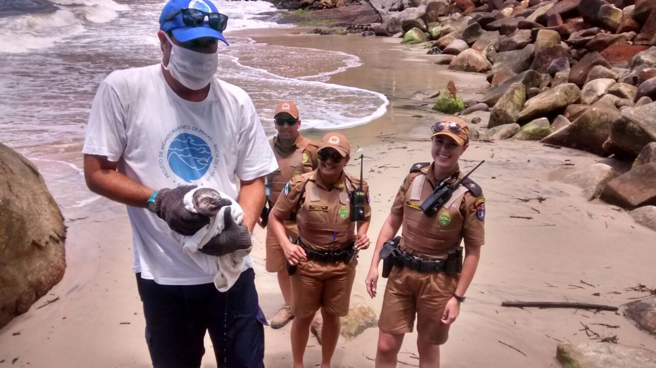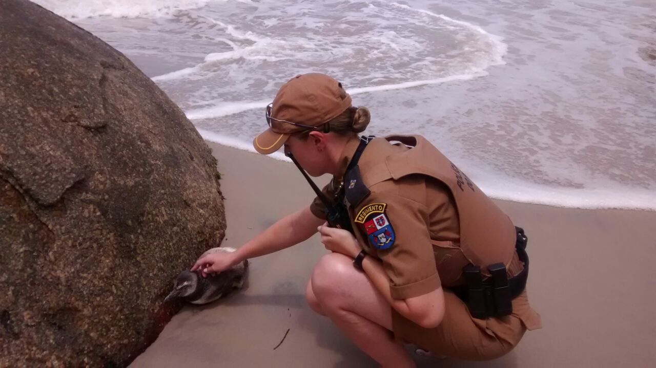 PM é acionada por pedestres e resgata pinguim ferido na Praia Mansa, em Matinhos