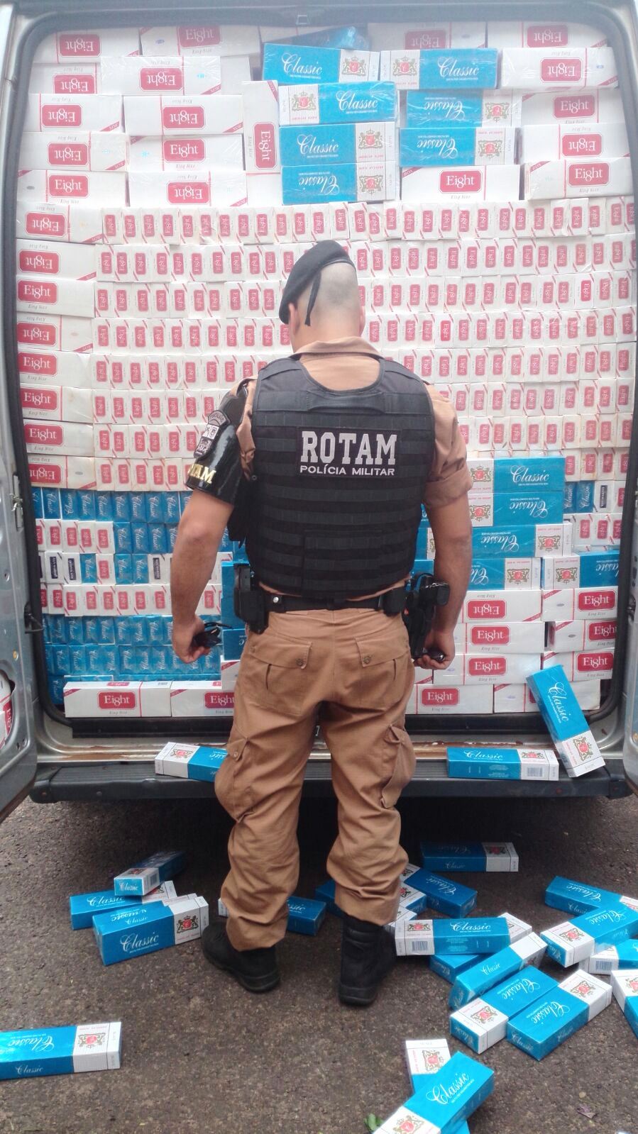 ROTAM apreende 170 caixas de cigarros contrabandeados durante ação em Tapejara (PR); dupla é conduzida à delegacia