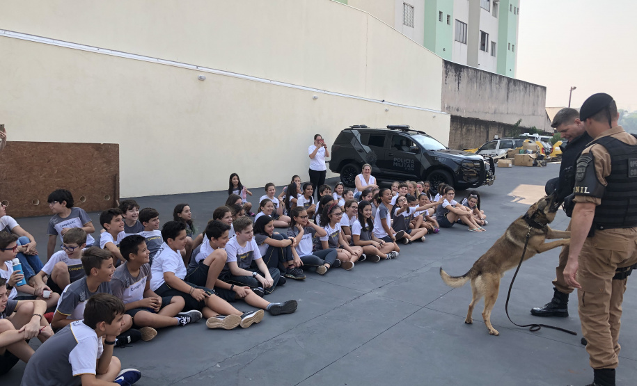 Acompanhados pelas professoras, os alunos foram recebidos pelos policiais militares da equipe da Operações com canil, onde fizeram uma exposição de equipamentos e viaturas, além de uma apresentação com os animais. A unidade conta com cinco cães preparados para busca de pessoas, localizar entorpecentes, policiamento em evento e operações policiais.