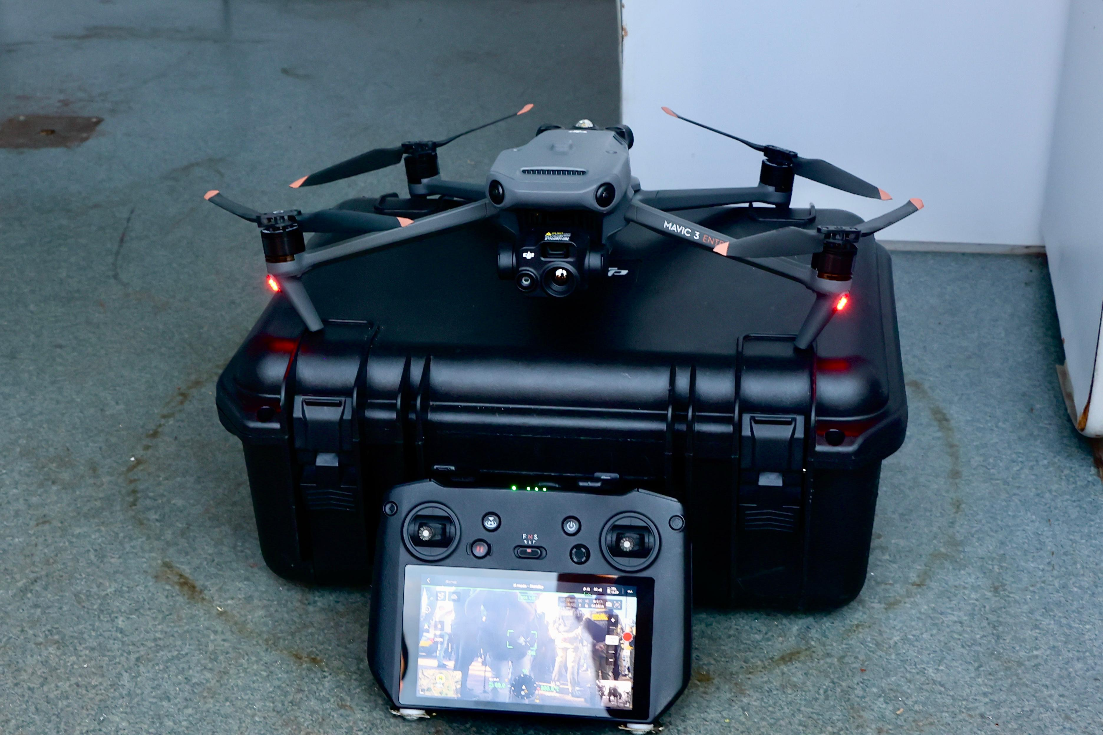 O DJI Matrice 300 RTK é um drone profissional amplamente utilizado por forças policiais e equipes de segurança pública para monitoramento aéreo, buscas e apoio em operações. A aeronave possui autonomia de voo de até 55 minutos, alcance de transmissão de cerca de 15 quilômetros e sensores em múltiplas direções para evitar colisões, além de permitir a instalação de câmeras térmicas e de zoom de longo alcance.