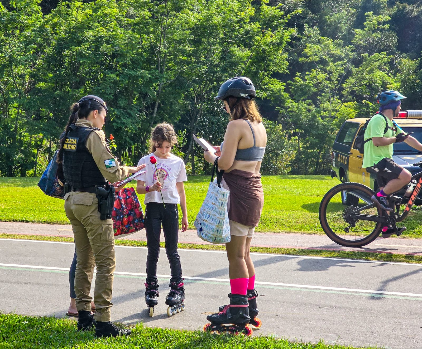 As mulheres que passaram pelos parques também receberam rosas de presente com os panfletos de orientações. A Ceasa apoiou a ação com a doação de 1.500 rosas que foram trabalhadas por custodiadas da Penitenciária Feminina de Piraquara para retirar os espinhos e embalar as flores.