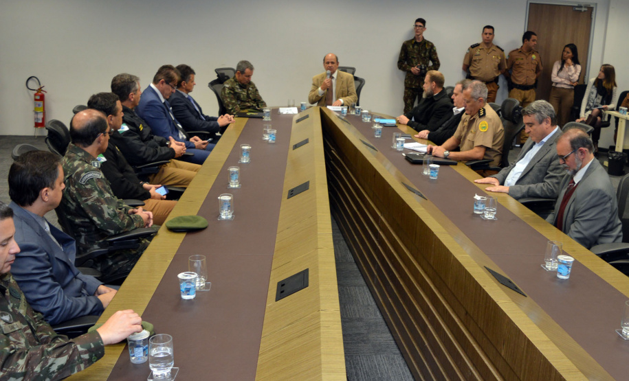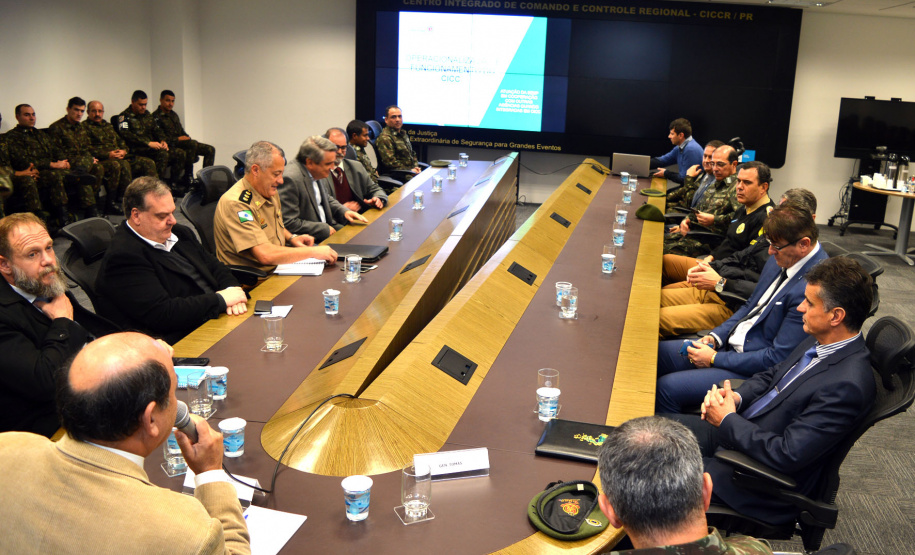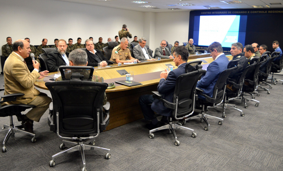 PRESENÇAS - Participaram do encontro o comandante-geral da Polícia Militar, coronel Péricles de Matos; o delegado-geral da Polícia Civil, Silvio Jacob Rockembach; o diretor-geral da Polícia Científica do Paraná, Leon Grupenmacher; o comandante-geral dos Bombeiros, coronel Samuel Prestes; o coordenador estadual de Proteção e Defesa Civil do Paraná, coronel Ricardo Silva; o diretor do Departamento Penitenciário do Paraná, Francisco Caricati; o diretor-geral da Secretaria, coronel Orlando Artur da Costa; e o assessor de Planejamento Estratégico e Gestão de Projetos, coronel Enio da Silva e o coordenador do Centro Integrado de Inteligência e Segurança Pública da Região Sul.