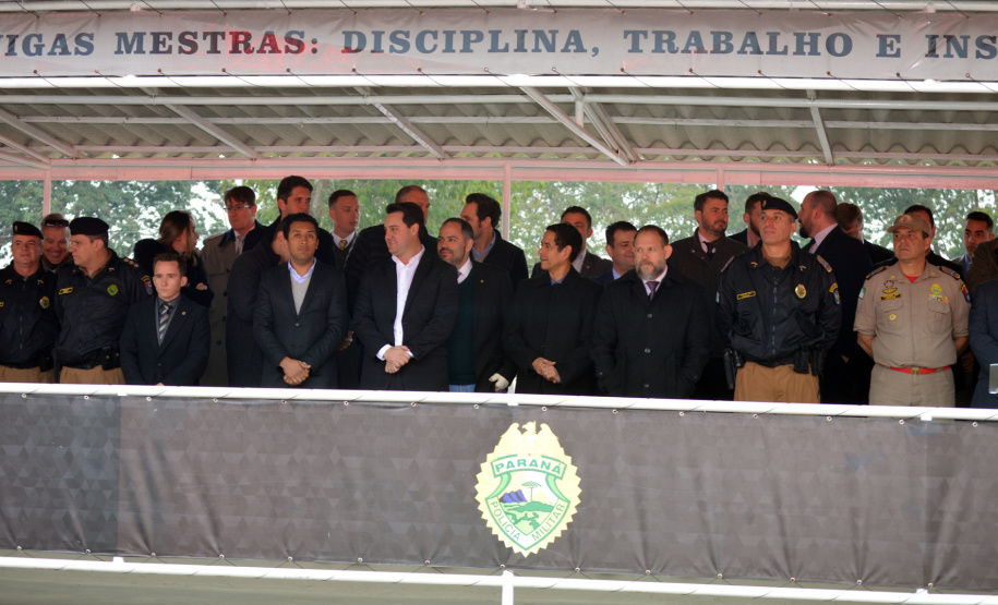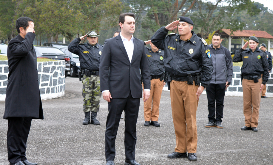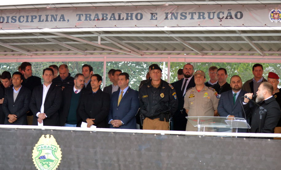 PRESENÇAS - Além do Governador e do Secretário de Segurança, estiveram no evento o Secretário da Casa Civil, Guto Silva, os deputados estaduais Thiago Amaral e Adriano José, o Comandante Geral da PM, coronel Péricles de Matos, o Comandante da Academia Policial Militar do Guatupê (APMG), coronel Ronaldo de Abreu, o Delegado Geral da Polícia Civil, Silvio Jacob Rockembach, o Comandante do Corpo de Bombeiros, coronel Samuel Prestes, além de comandantes de unidades da PM, oficiais e praças da Corporação e convidados.