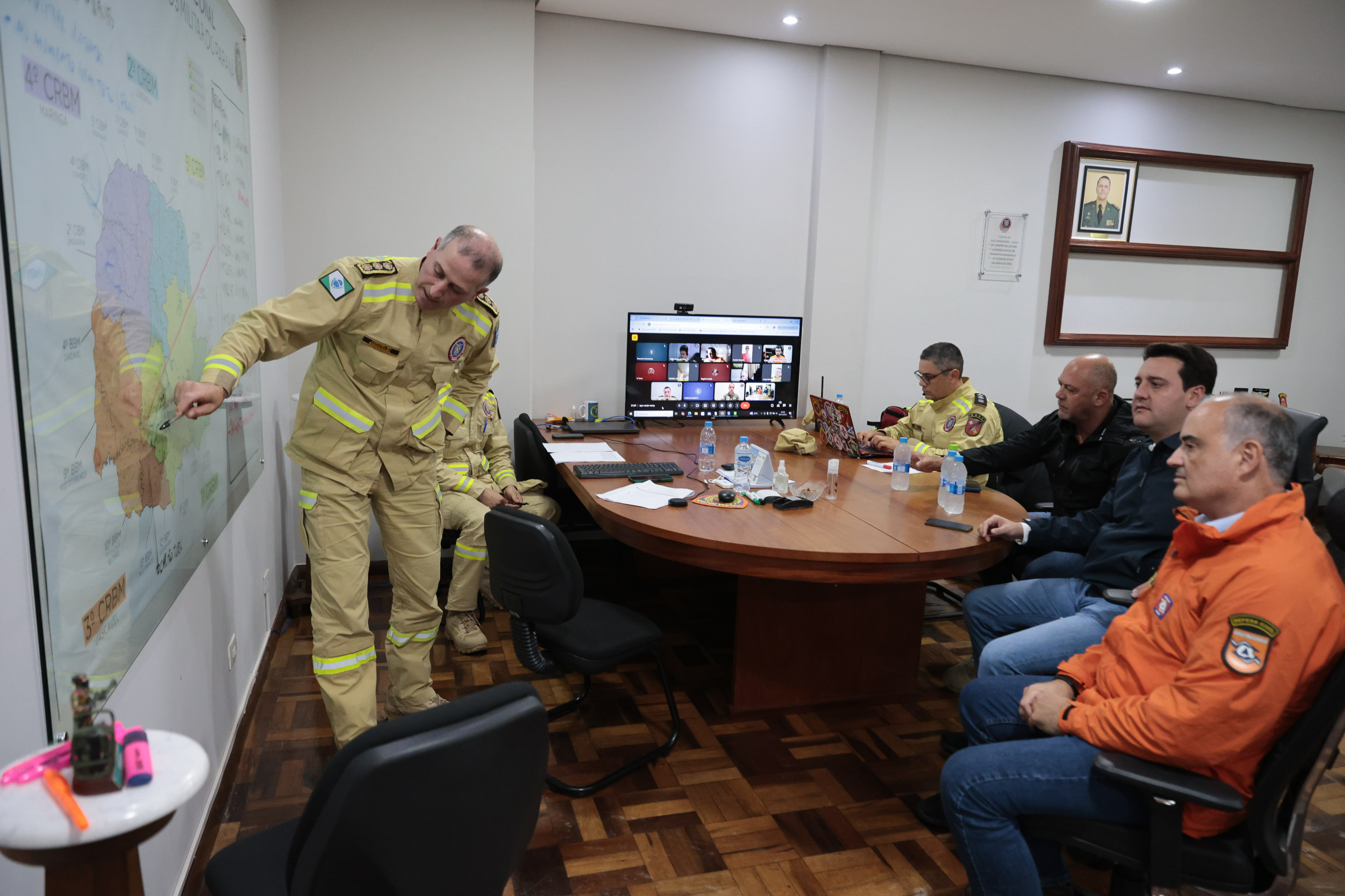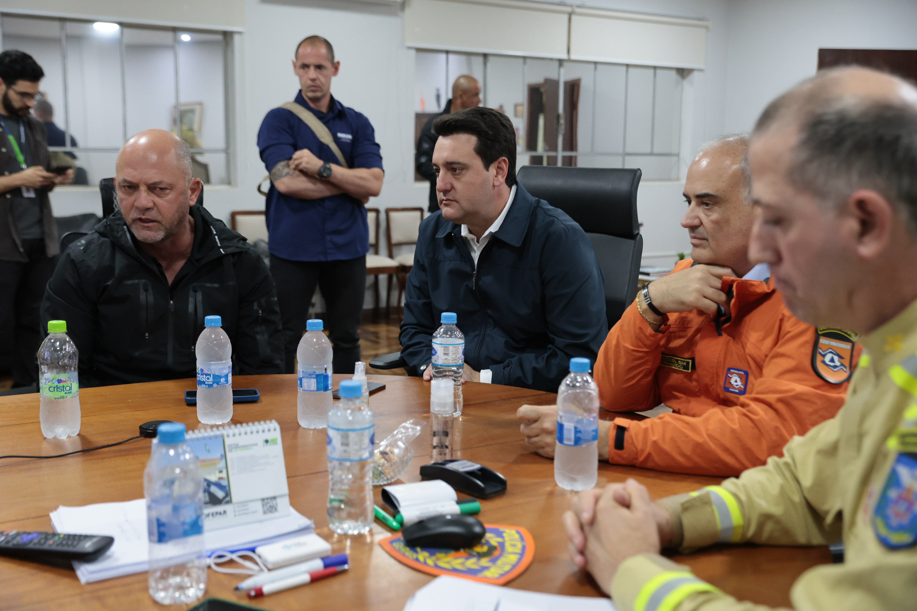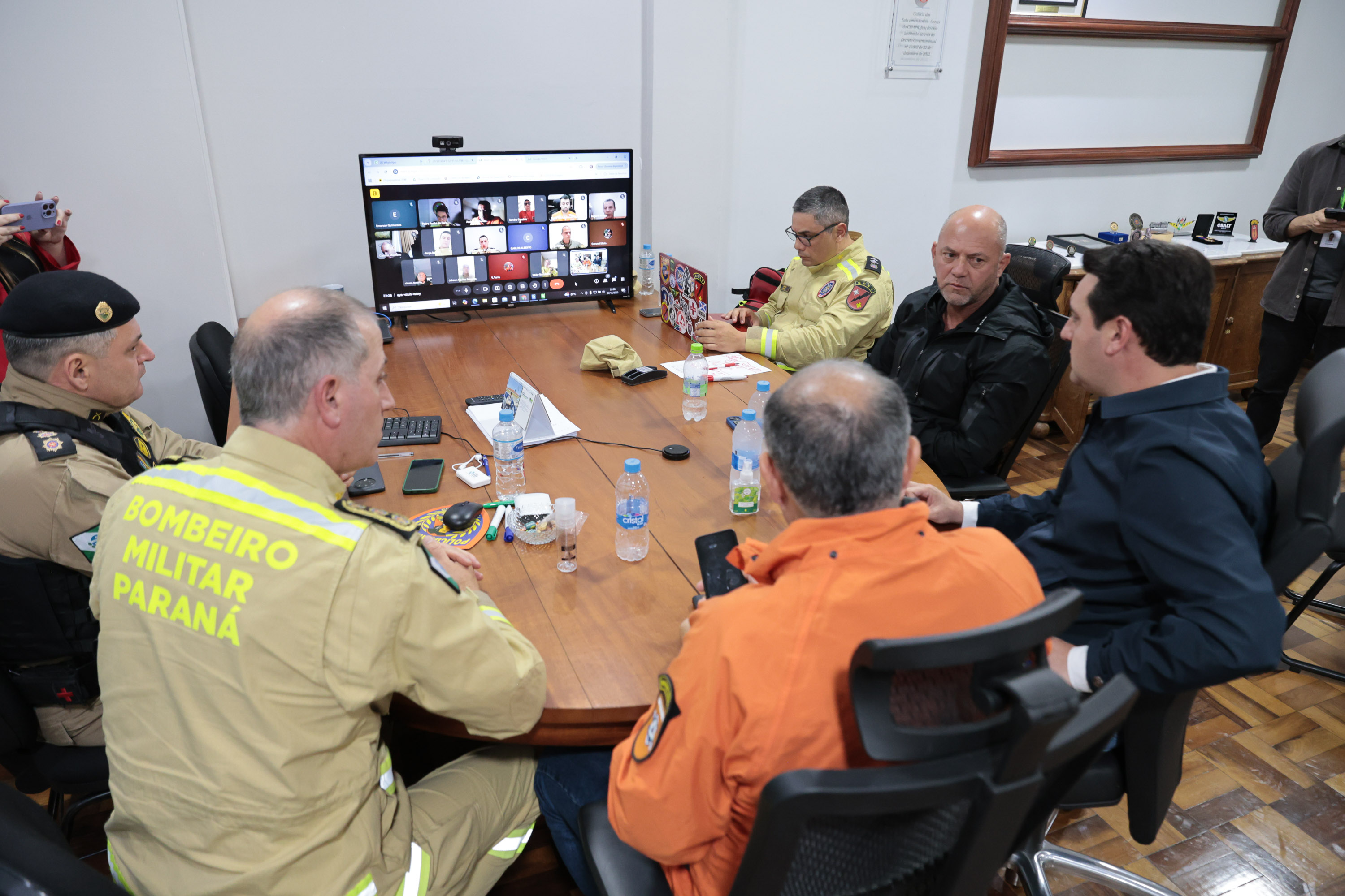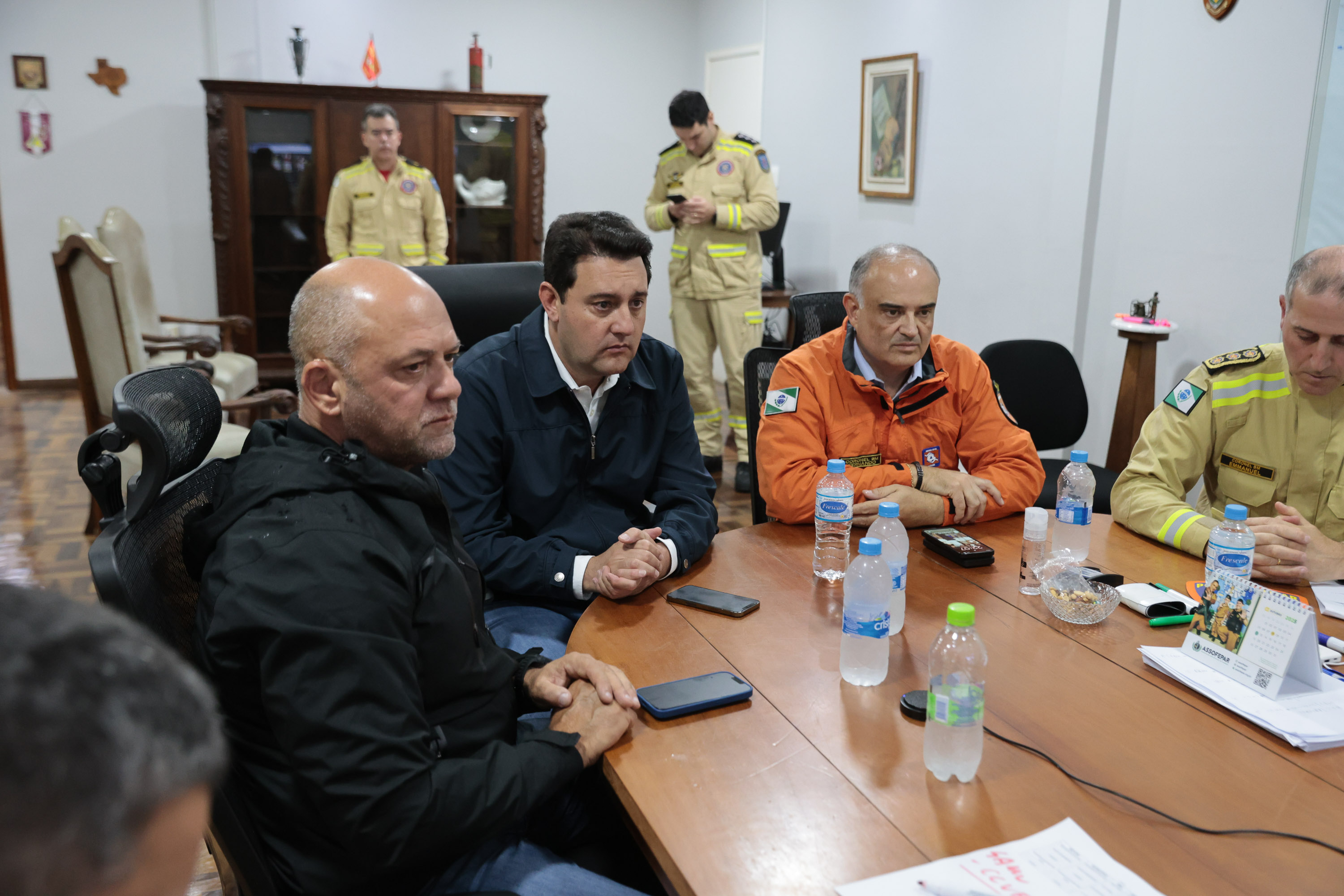 O governador Carlos Massa Ratinho Junior comandou uma reunião de emergência na noite desta sexta-feira no Quartel Central do Corpo de Bombeiros com o secretário da Segurança Pública, Hudson Leôncio Teixeira, o coordenador da Defesa Civil do Paraná, coronel Fernando Schunig, e representantes do Corpo de Bombeiros e Polícia Militar. Ele também participou de uma videoconferência com bombeiros, policiais, representantes da Defesa Civil das regiões mais afetadas e meteorologistas do Simepar para entender a dimensão dos estragos.