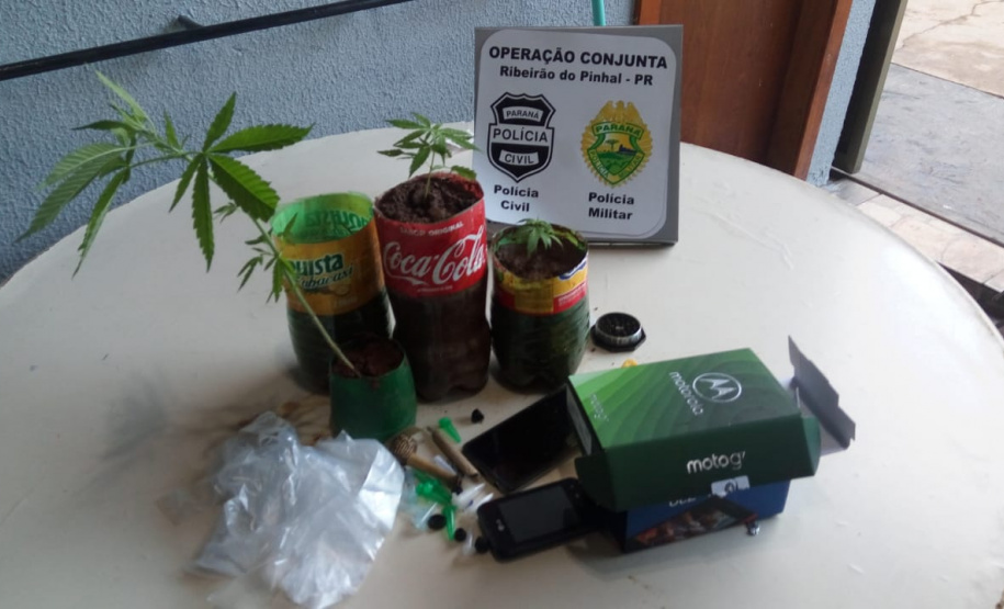 Durantes as buscas, a PCPR, com o apoio da Polícia Militar, localizou uma plantação de maconha e apreendeu diversas porções da droga, bem como pinos de cocaína e aparelhos celulares.