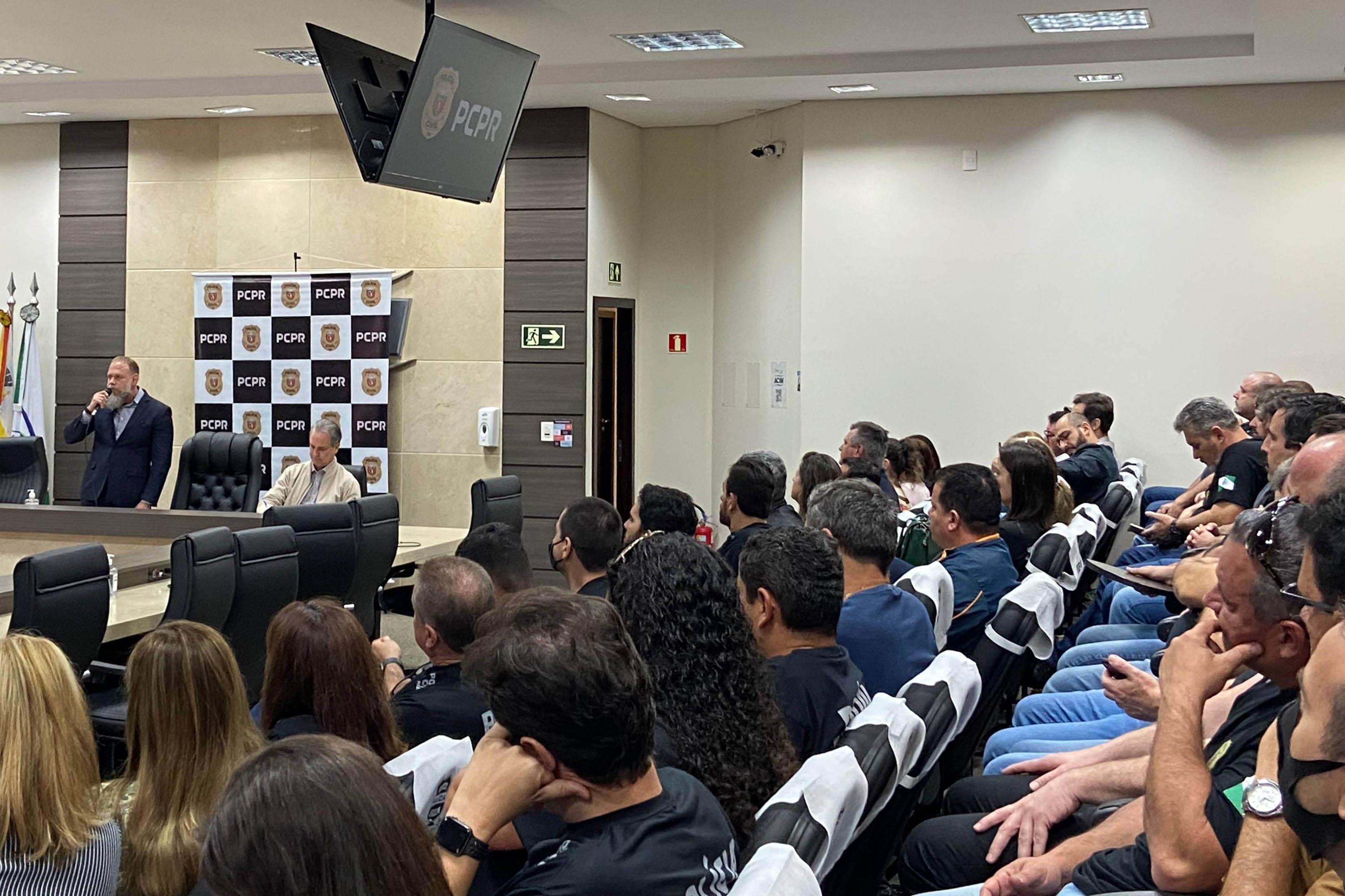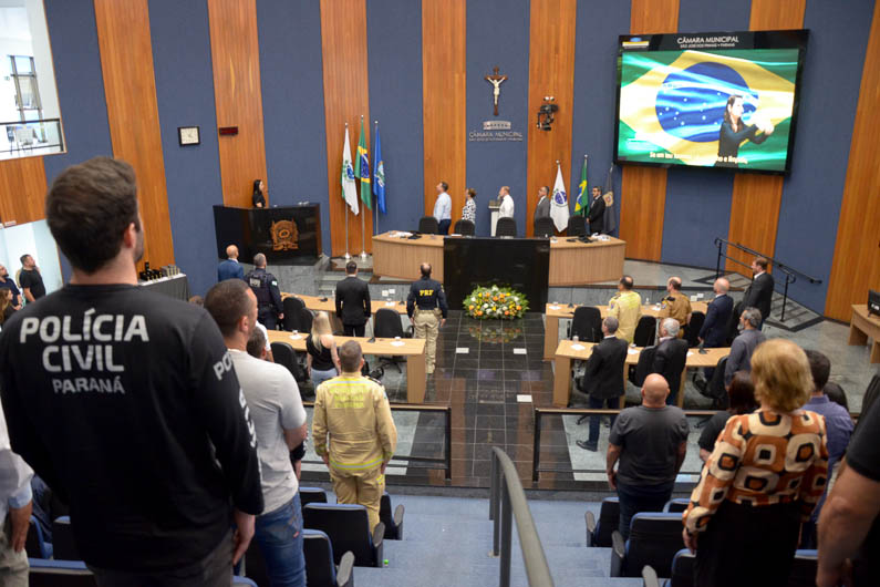 PRESENÇAS – Participaram do evento em São José dos Pinhais a prefeita Nina Singer; o delegado Vinícius Carvalho, representando a Secretaria da Segurança Pública do Paraná; o presidente da Câmara Municipal de São José dos Pinhais, Abílio Alves; o delegado-adjunto da Divisão de Polícia Metropolitana, Anderson Ormeni Franco; o delegado-chefe da Divisão de Crimes Contra o Patrimônio, Valderes Scalco; o delegado-chefe da 1ª Delegacia Regional de São José dos Pinhais, Fábio Machado dos Santos; representando a Polícia Militar, o comandante do 17° Batalhão de São José dos Pinhais, Eleandro de Azevedo; o comandante do 6° Grupamento de Bombeiros, tenente-coronel, Emerson José Guimarães Ferreira; representando a Polícia Rodoviária Federal e também vereador de Araucária, Fábio Pavoni; o presidente da Ordem dos Advogados do Brasil de São José dos Pinhais, Fabiano da Rosa; o delegado e vereador, Michel Teixeira; o delegado Tito Barichello; a delegada Tathiana Guzella;o delegado de Almirante Tamandaré, Cassiano Aufiero; o delegado de Campina Grande do Sul, Eduardo Machado; e o delegado de Pinhais, Hormínio de Paula.