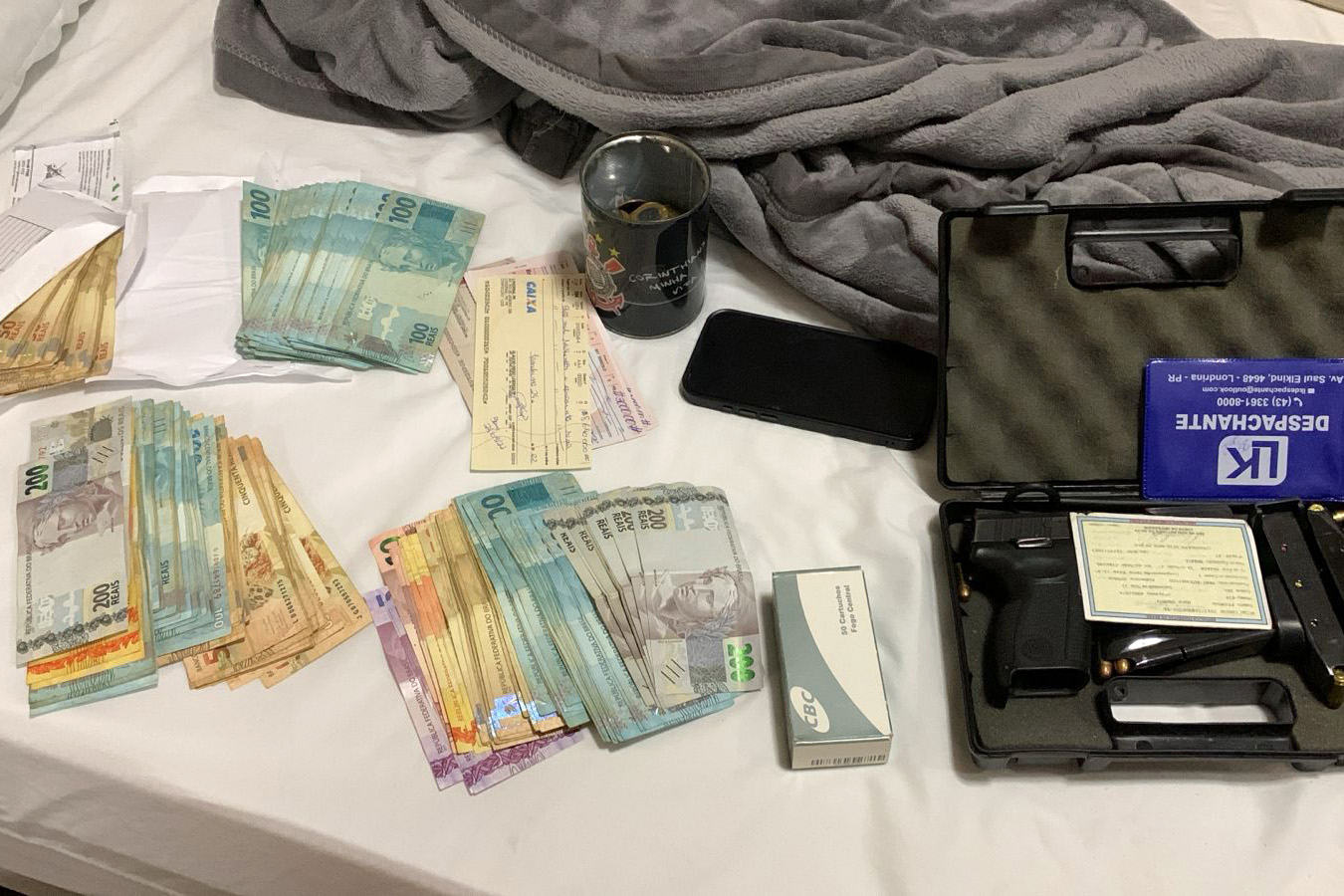 As buscas aconteceram em endereços residenciais e comerciais ligados aos suspeitos. Nos locais, os policiais apreenderam mais de R$ 70 mil em espécie, além de cheques e pedras preciosas. Veículos de luxo, aparelhos comunicadores, armas de fogo, munições e porções de drogas também foram localizadas.