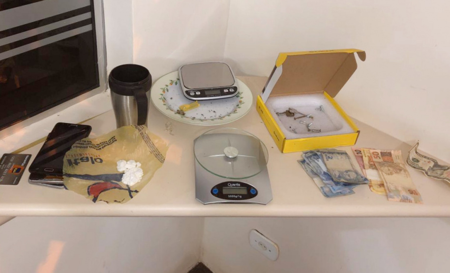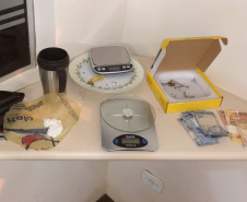 Em cima da mesa da cozinha foram apreendidos uma balança de precisão, um prato com porções de cocaína e maconha e dois celulares. Durante a abordagem, os policiais presenciaram um adolescente de 16 anos chegando ao local e solicitando uma bucha de cocaína. Questionada sobre os fatos, a suspeita permaneceu em silêncio.