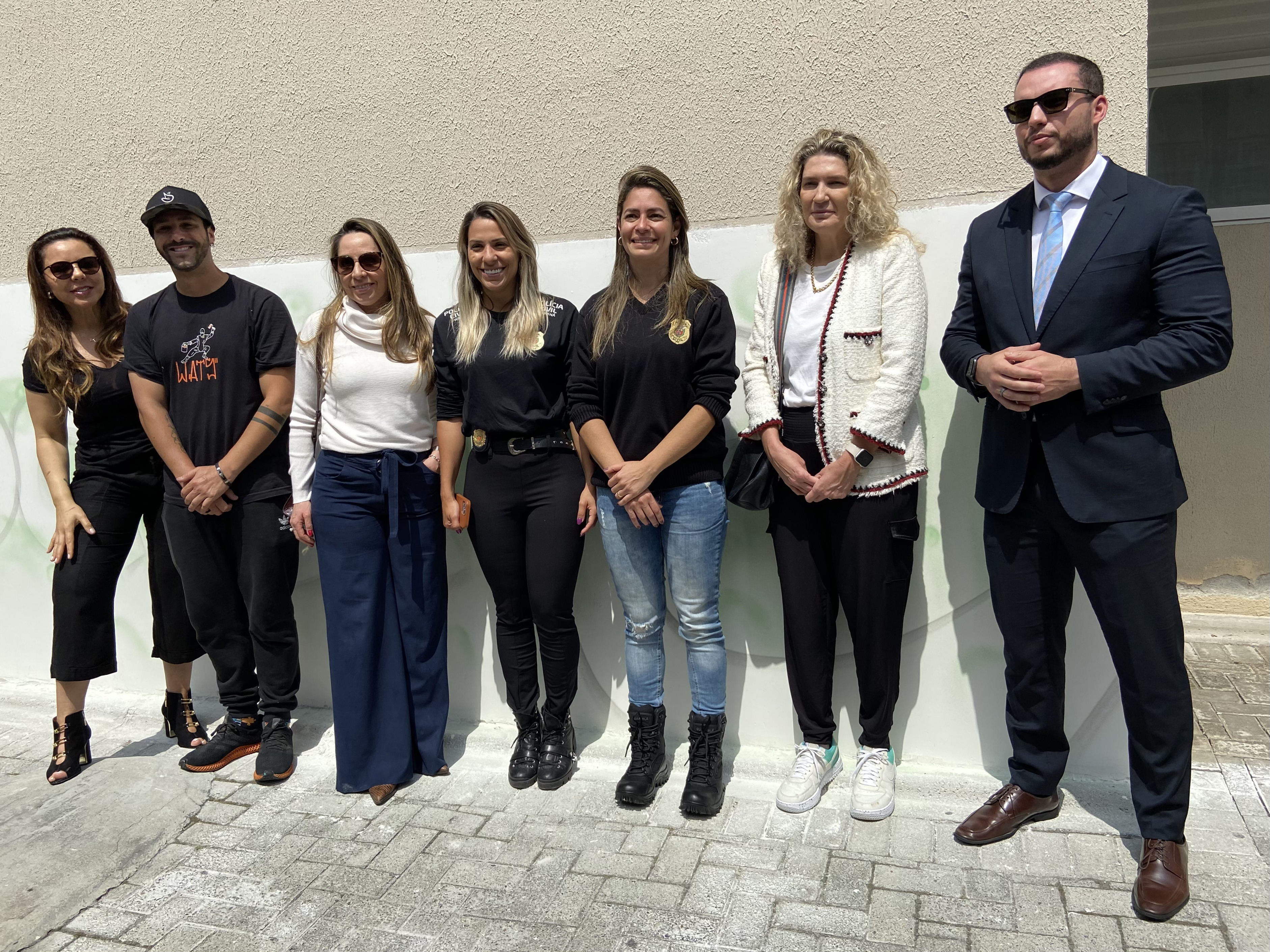 PRESENÇAS- Participaram do evento, o Assessor Civil da Secretaria de Segurança Pública e Delegado da PCPR, Leonardo Carneiro, a Delegada-Chefe da Divisão de Polícia Especializada, Luciana Novaes, a Delegada-Adjunta da Divisão de Polícia Especializada, Alcileny Artigas, o presidente da Adepol e delegado da PCPR, Gutemberg Luz Neves Ribeiro, a Promotora de Justiça Tarcila Teixeira, a Promotora de Justiça Carolina Rockembach, e o artista urbano Michael Devis.