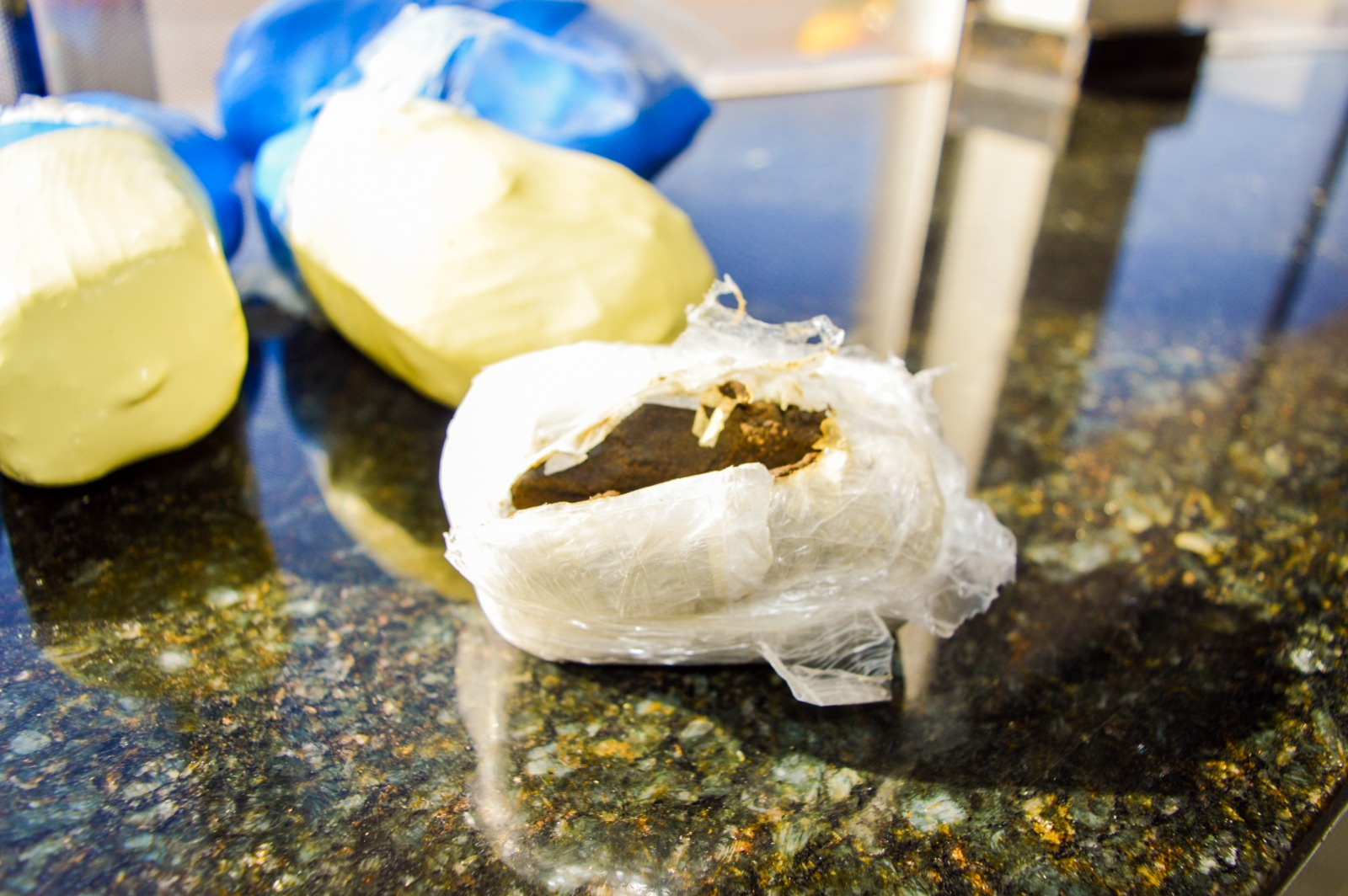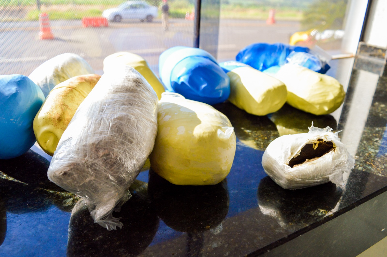Após a retirada e pesagem do material, foram apreendidos aproximadamente 3,35 quilos de substância análoga a skunk e cerca de 200 gramas de haxixe. Também foram apreendidos dois aparelhos celulares.