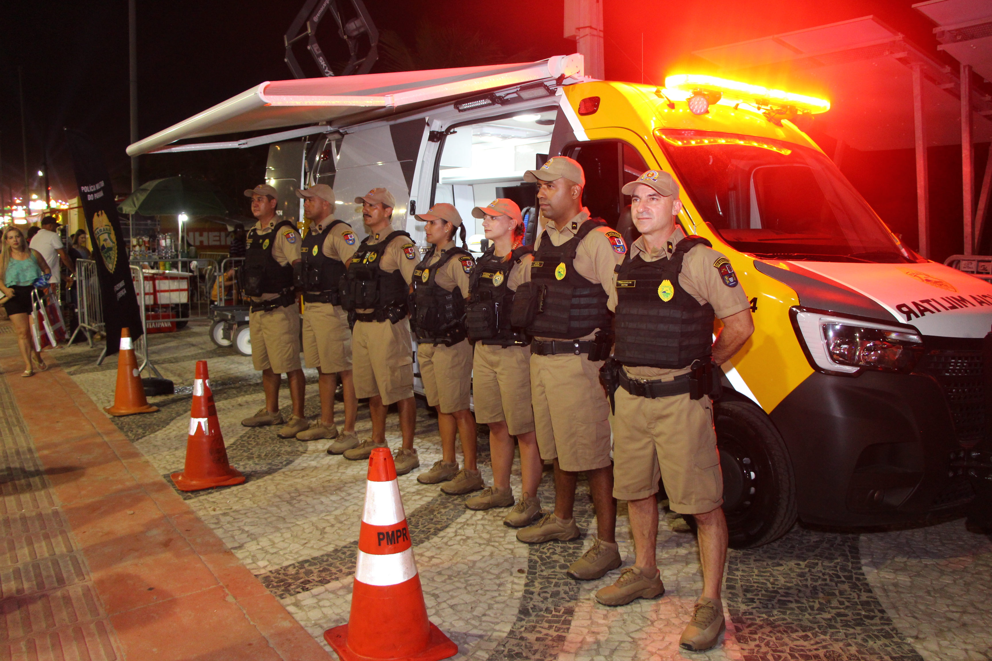 As ações de policiamento voltadas ao público do show envolveram equipes que atuaram no policiamento a pé, assegurando proximidade com o público e rápida intervenção quando necessário. O policiamento com motocicletas, realizado pela Companhia Independente de Rondas Ostensivas com Aplicação de Motocicletas (CIROCAM), garantiu agilidade no deslocamento e pronta resposta. Bases móveis distribuídas ao longo da orla de Matinhos promoveram ações de orientação ao público e identificação de crianças por meio de pulseiras.