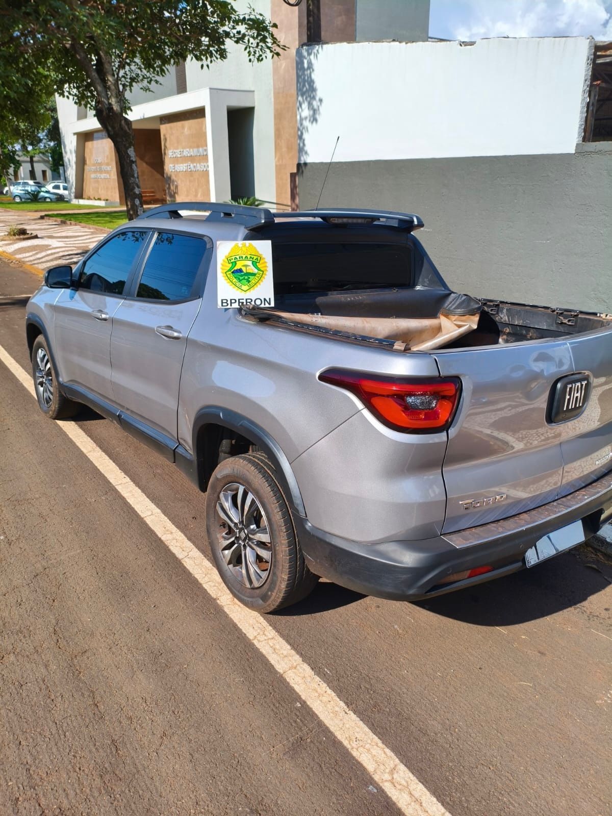 Durante as buscas, foi localizado um veículo Fiat/Toro, de cor prata, equipado com rádio comunicador, adaptado com sistema de emissão de fumaça e com apenas o banco do motorista instalado, características comuns em veículos utilizados para apoio a ações de contrabando. Além disso, o automóvel possuía registro de boletim de ocorrência por fraude, após desvio de carregamento.