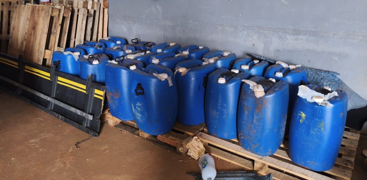 No interior do local, os policiais encontraram 19 galões de 50 litros cada. Também foi apreendida uma caminhonete Ford F-4000, de cor amarela, com fundo falso, vestígios de substância análoga à maconha e rádio comunicador instalado.