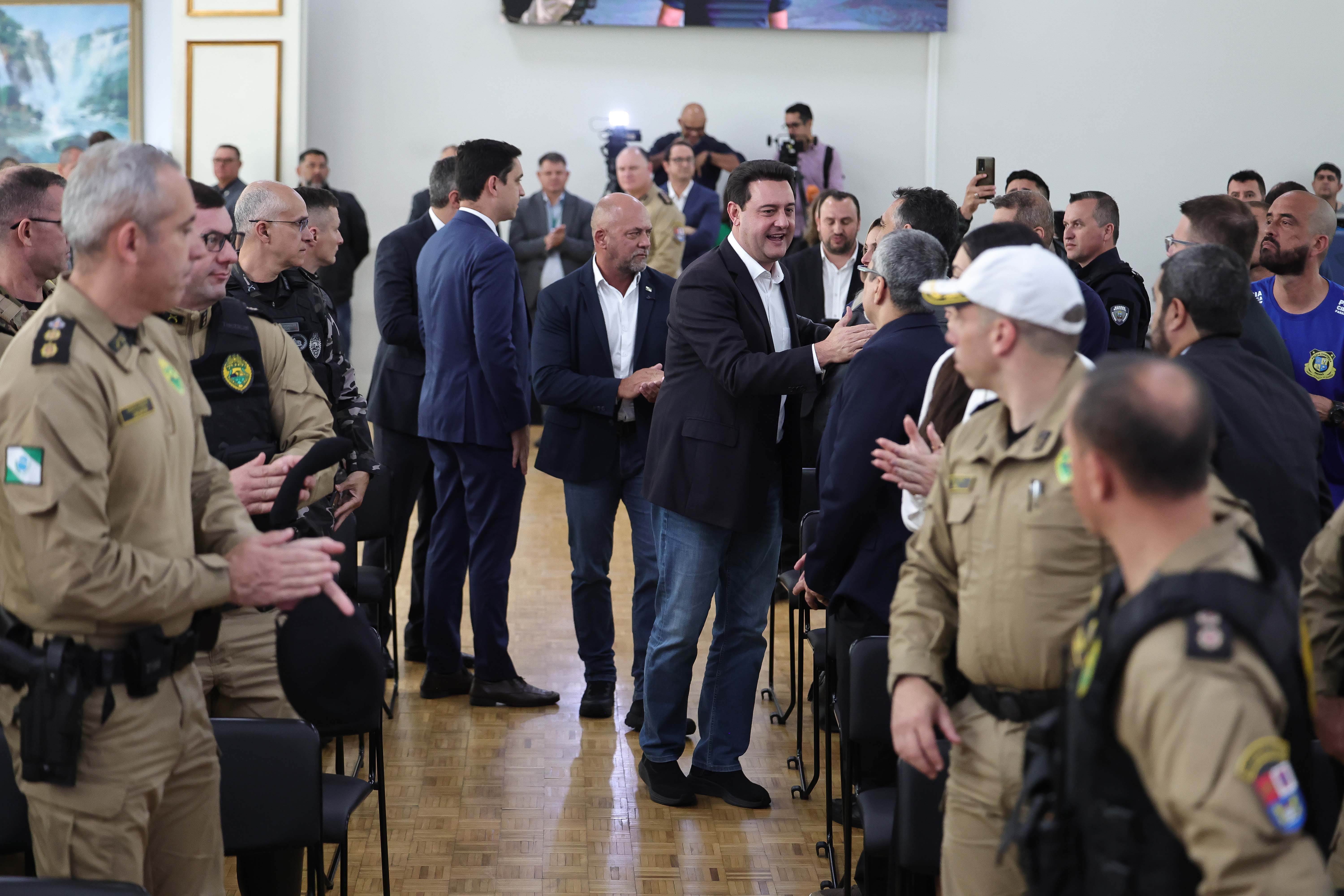 O Paraná deu nesta quarta-feira (10) um importante passo visando a integração das forças de segurança pública do Estado e dos Municípios. Em evento no Palácio Iguaçu, o governador Carlos Massa Ratinho Junior e o secretário da Segurança Pública (Sesp), Hudson Teixeira, anunciaram uma série de iniciativas para aprimorar o trabalho conjunto entre as polícias estaduais e as guardas municipais (GMs). Elas incluem padronização de ações e treinamento, a unificação do uso de sistemas e até mesmo uma proposta de mudança na legislação.