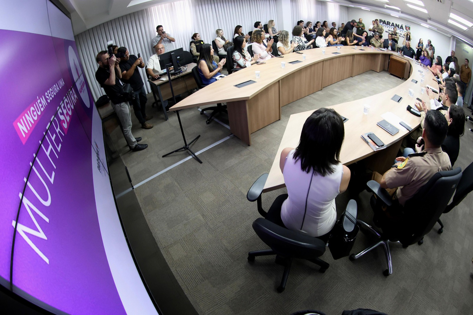 PRESENÇAS – Também estiveram presentes no evento a desembargadora Cristina Tereza Willy Ferrari, representando o Tribunal de Justiça do Paraná (TJPR); a procuradora Tarcila Santos Teixeira, representando o Ministério Público do Paraná (MP-PR); a diretora-geral da Polícia Penal do Paraná (PPPR), Ananda Chalegre dos Santos; a major Carlina Zancan, coordenadora da Patrulha Maria da Penha, da Polícia Militar do Paraná (PMPR); entre outras autoridades. A deputada estadual Mara Lima, autora da lei do aplicativo Salve Maria falou aos presentes por vídeo.
