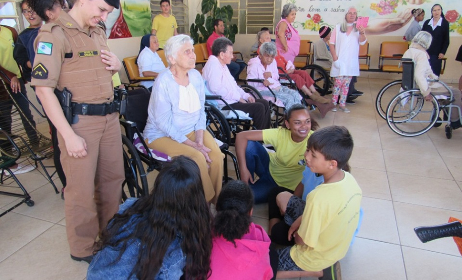 O evento ocorreu para cumprir a agenda de ações comemorativas que a Polícia Militar costumeiramente faz no mês de agosto, quando completa aniversário. Já são 165 anos de existência até aqui. Adolescentes da “Associação Rainha da Paz”, projeto que também recebe o carinho dos policiais em atividades desenvolvidas pela Corporação – como aconteceu durante um evento que o site da PMPR publicou na última quinta-feira (23/08) – participaram da visita aos idosos.
