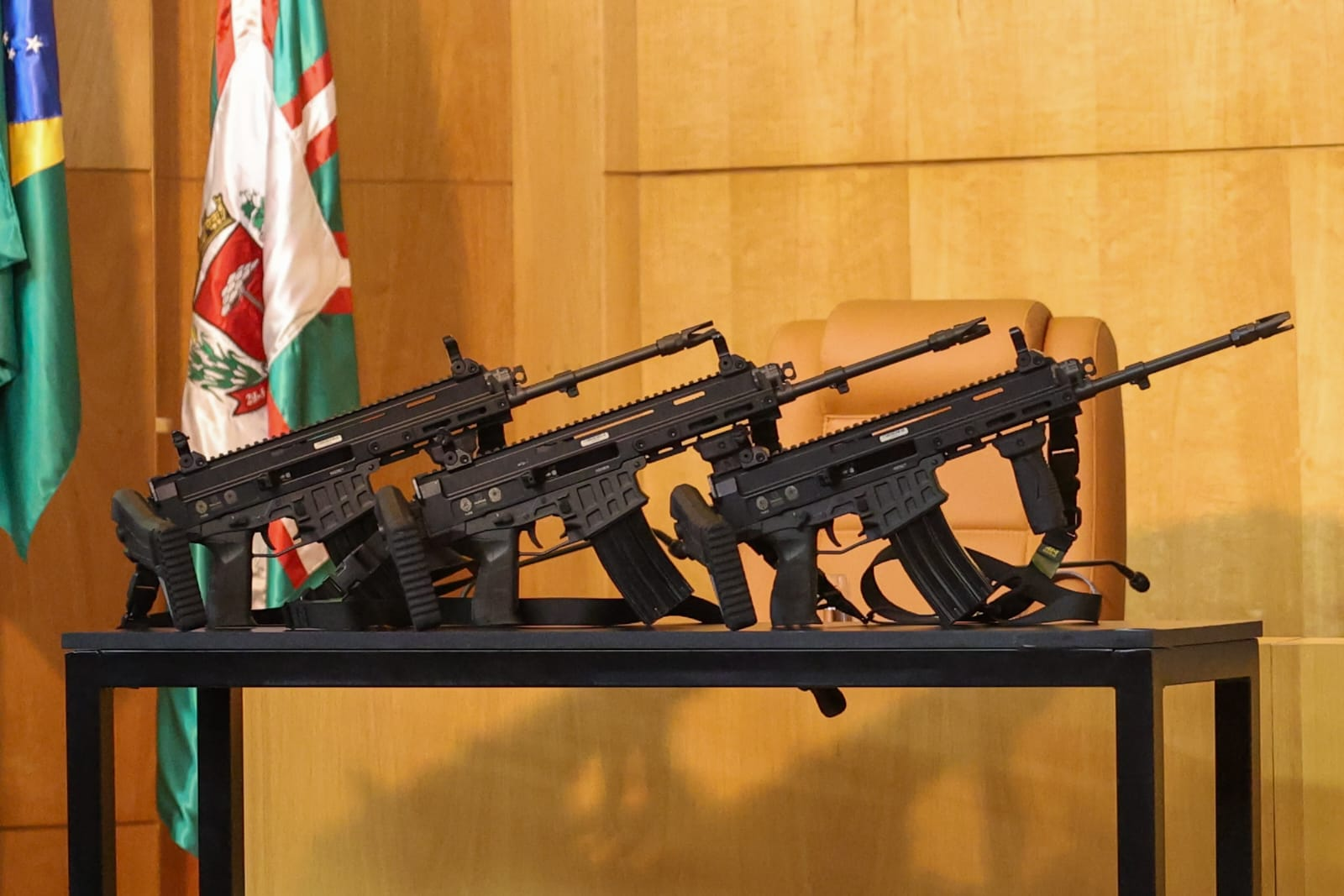 Na ocasião, o Governo do Estado, por meio da Secretaria da Segurança Pública, realizou a entrega de 10 fuzis calibre 5,56mm, adquiridos com recursos do Fundo Estadual de Segurança Pública (Funesp), totalizando R$ 97.725,90. Também foram entregues 10 viaturas descaracterizadas, igualmente financiadas pelo Funesp, no valor de R$ 1.225.000,00. Os equipamentos serão destinados ao apoio operacional das ações integradas com o GAECO e demais frentes de atuação do Ministério Público.