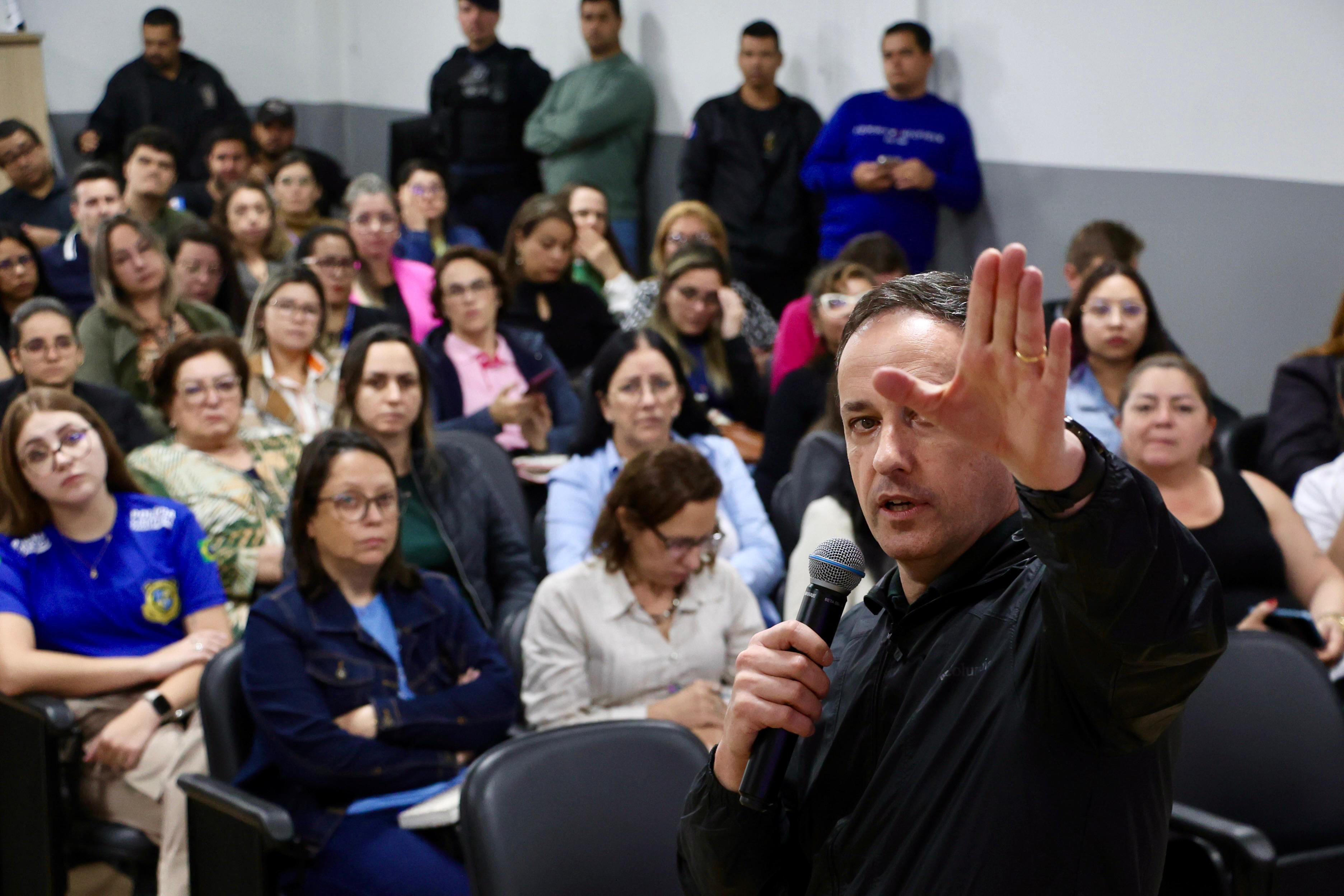 Dalton Gean Perovano apresentou as ações do Programa Mulher Segura, iniciativa de caráter permanente que atua em diferentes frentes de enfrentamento à violência de gênero. O programa contempla ações preventivas, com palestras e atividades educativas sobre os direitos da mulher, empoderamento feminino, autodefesa e prevenção de crimes. Em outra vertente, o foco repressivo inclui o fornecimento de celulares às vítimas, com o monitoramento eletrônico simultâneo do agressor e da mulher com medida protetiva de urgência. O programa também prevê a instalação da Sala Mulher Segura nas Delegacias da Polícia Civil, espaços preparados para acolher e atender mulheres em situação de violência.