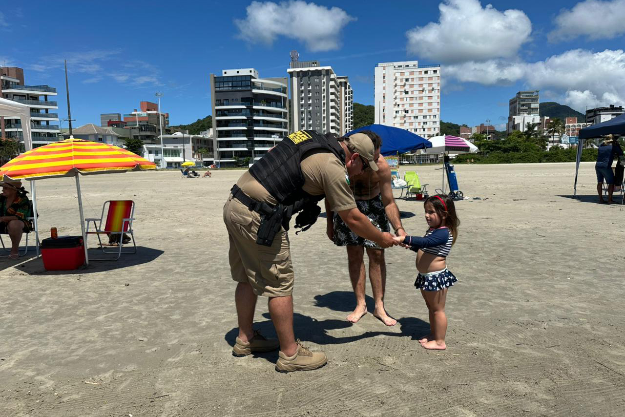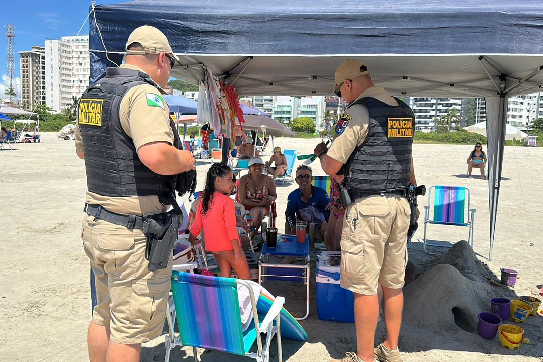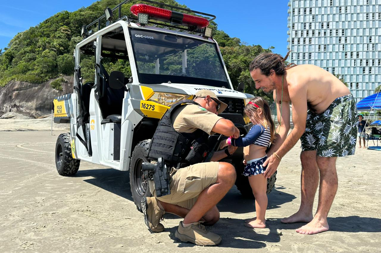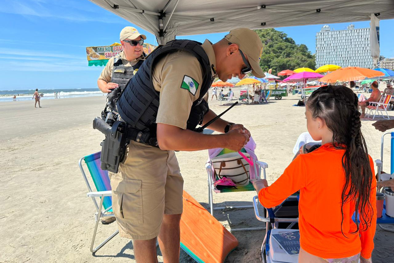 Durante os patrulhamentos, policiais militares interagem com o público nas praias, distribuindo pulseiras de identificação para crianças e orientando pais e responsáveis sobre temas sensíveis, como importunação sexual e violência contra as mulheres. As ações de conscientização integram a programação do Verão Maior Paraná e são realizadas ao longo de todo o período do evento.